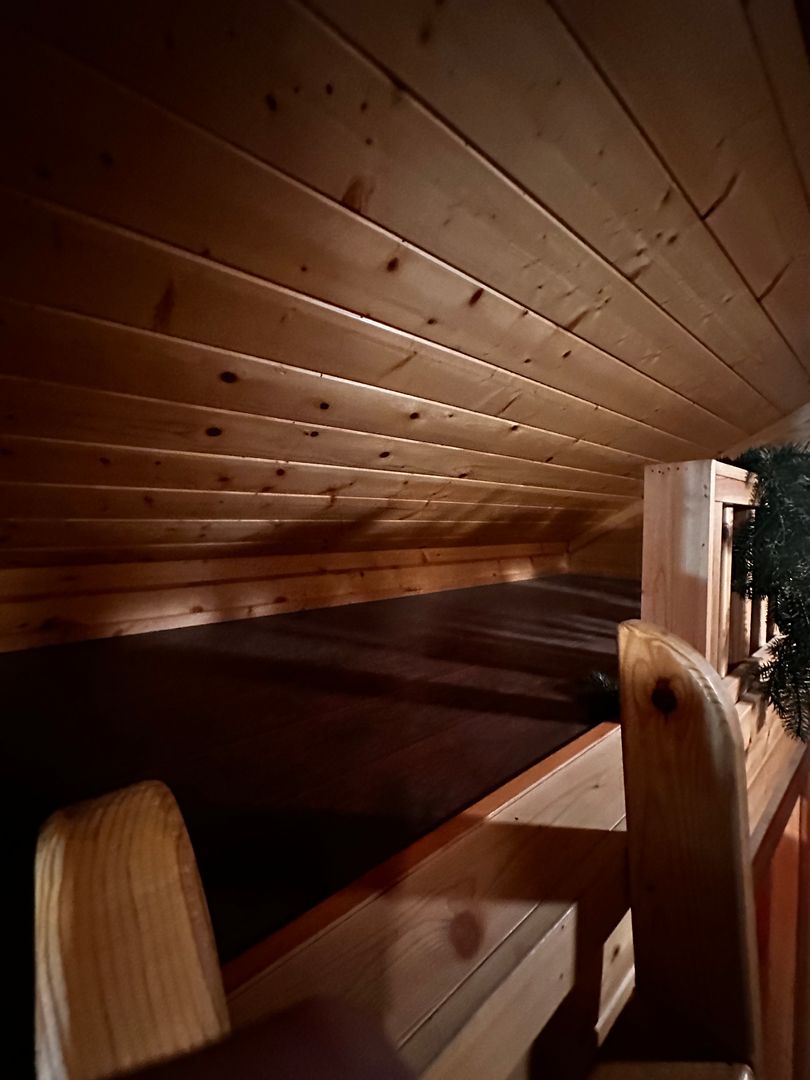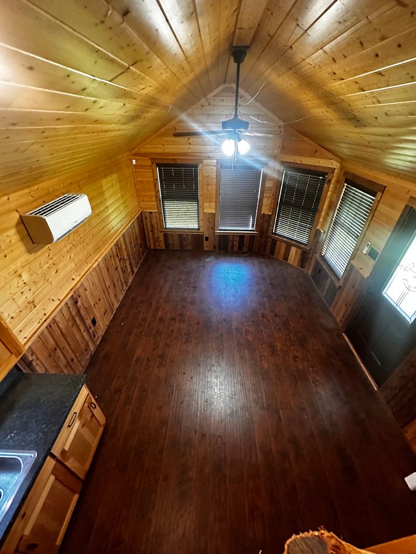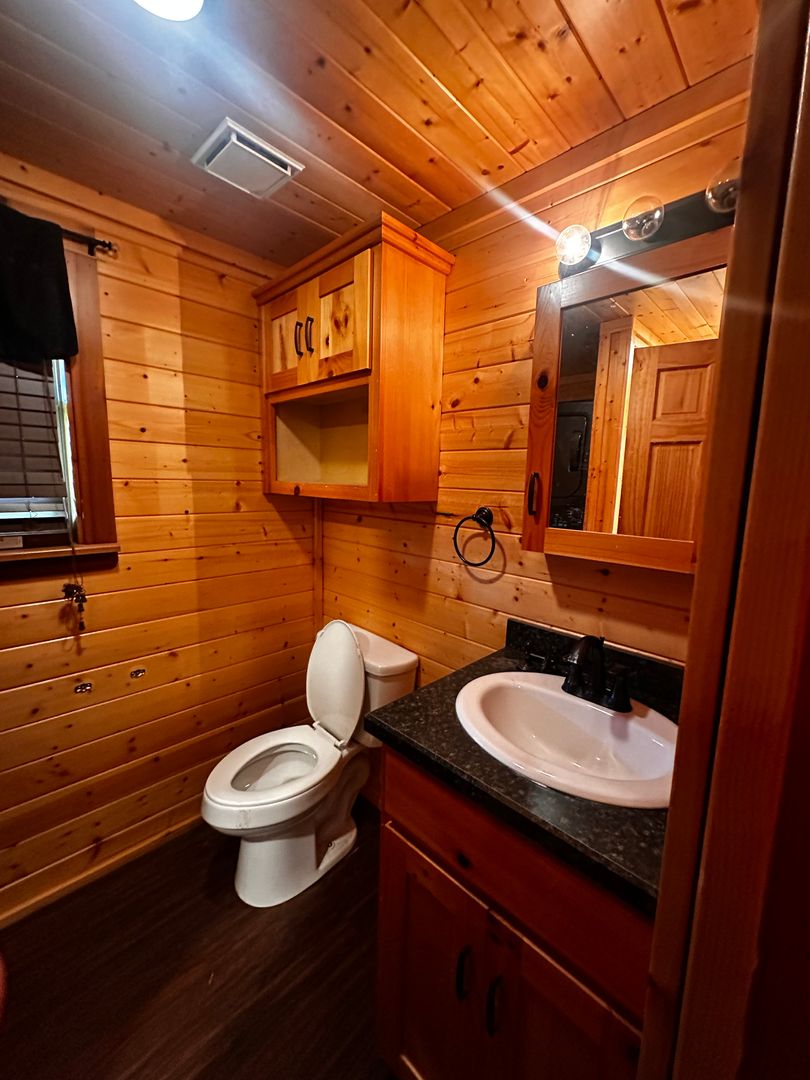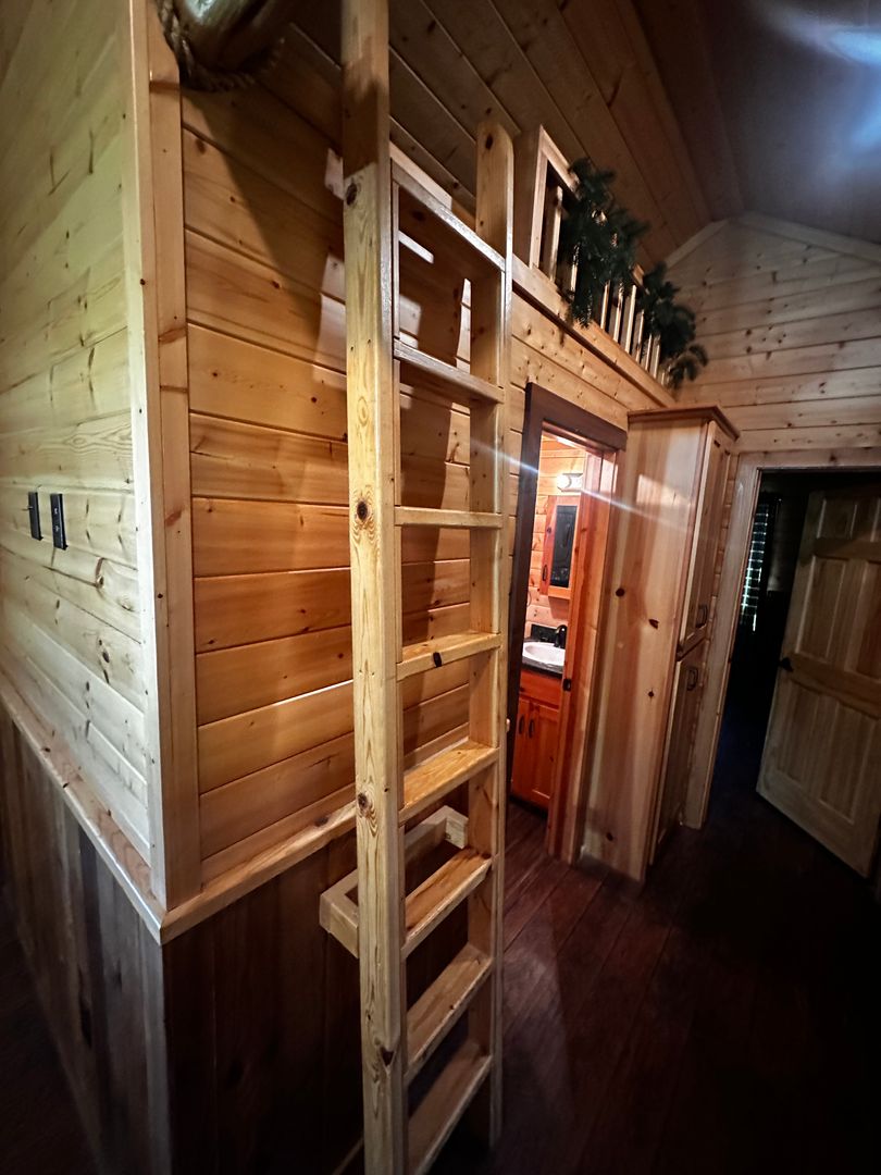 Inside, the cozy cabin features warm, inviting interiors, while outside, a covered patio provides the perfect spot to relax and enjoy the open air, rain or shine.